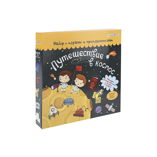 Набор с играми и приключениями «Путешествие в космос» помогут детям в компании взрослых отправиться в настоящее космическое путешествие. Основа этой настольной игры – игровое поле-ходилка, перемещаться по которому игрокам помогут кубики и карточки с заданиями. Также в комплекте есть специальные паспорта путешественников и визы-наклейки, которые наклеиваются в паспорт после удачного завершения очередной космической миссии. Не предназначена для игр с участием детей до трех лет. Качество игры и материалов соответствует требованиям профильного регламента Таможенного союза.