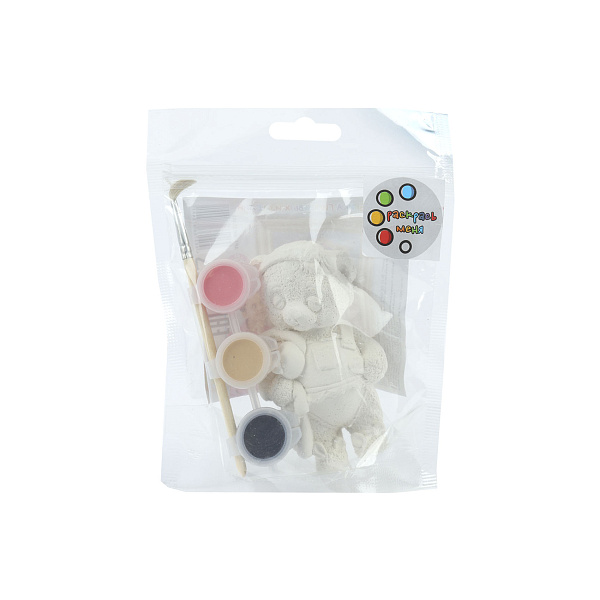 Набор с красками и кистью «Мишка с зайкой» приглашает мальчиков и девочек в мир творчества. В комплекте с белой гипсовой фигуркой медведя и зайца идут 3 небольшие упаковки с красками разных цветов и кисточка.