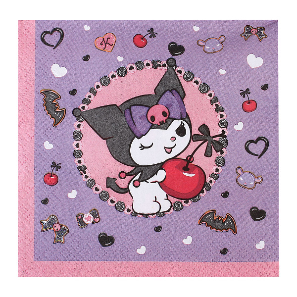 Набор салфеток «Kuromi» включает 20 ярких бумажных салфеток размером 33x33 см, выполненных из 100% целлюлозного волокна. Каждая салфетка украшена красочным рисунком с изображением популярного персонажа Куроми, что придает продукту уникальный стиль и привлекает внимание.