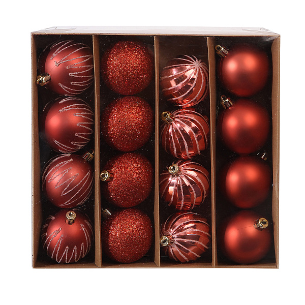 Создать новогодний дизайн в единой цветовой гамме несложно при помощи комплекта из 16 шаров. Изделия объединяет цветовая гамма и схожее декоративное оформление. Красный цвет подчеркнет праздничную атмосферу и торжественность события. Игрушки имеют стандартное крепление в виде петли. Длину подвески при желании легко скорректировать. Набор упакован в коробку из плотного картона. Она надежно защищает содержимое при транспортировке, может применяться для последующего хранения. При бережном обращении реквизит долгое время сохраняет привлекательность, может применяться многократно.