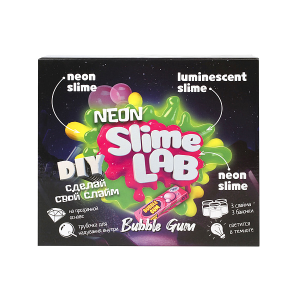 Slime Lab Neon– это увлекательная детская лаборатория, где можно своими руками создать эластичные слаймы. В комплекте представлено все, что понадобится юному химику: флаконы, пипетки, палочки и реагенты (натуральные красители и ароматизаторы, клей). Следуя инструкции и смешивая детали, ребенок получит 3 эластичных слайма с ароматом бабл гам: 2 неоновых слайма желтого и розового цвета, а также светящийся в темноте слайм. Для каждой массы прилагается отдельная баночка. Трубочка в наборе предназначена для надувания слайма изнутри.