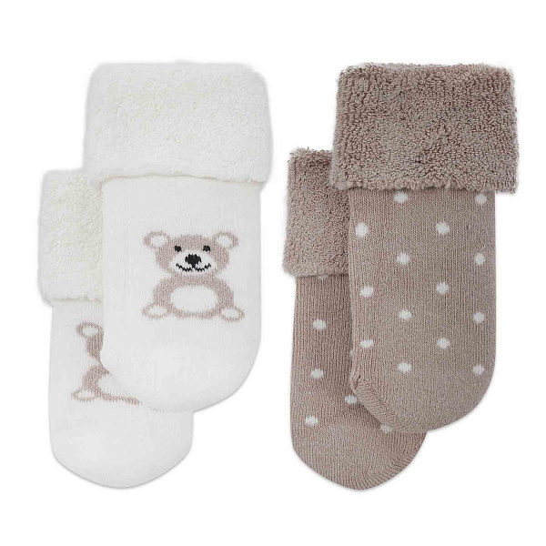 Комплект из двух пар теплых носков выполнен из хлопка, что обеспечивает натуральность, мягкость и комфорт при носке. Первая пара носков кремового цвета украшена изображением милого медвежонка и оснащена плотным отворотом из мягкой махровой ткани для дополнительного утепления. Вторая пара выполнена в бежево-коричневом цвете с контрастным белым горошком и таким же мягким отворотом. Обе модели идеально подходят для прохладного времени года, сочетая тепло, комфорт и привлекательный дизайн.