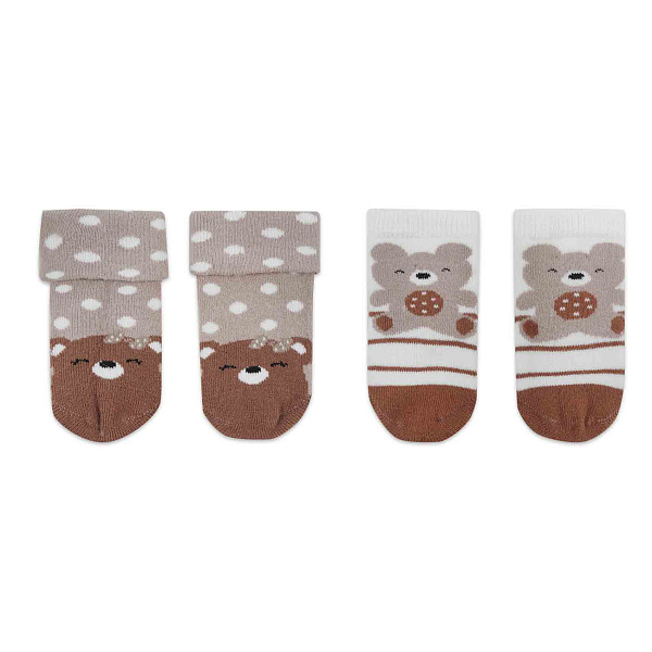 Комплект из двух пар теплых носков для девочек выполнен из хлопка, что обеспечивает максимальную мягкость и комфорт при носке. Первая пара носков светло-бежевого цвета с белыми и коричневыми полосками и изображением улыбающегося мишки на верхней части стопы, с коричневыми носком и пяткой. Вторая пара носков бежевого цвета с белыми горошинами и изображением мордочки медвежонка, оснащена отворотом для дополнительного утепления. Оба варианта носков идеально подходят для холодного времени года, обеспечивая тепло и уют детским ножкам.