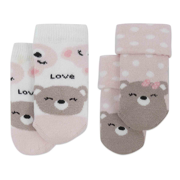 Комплект из двух пар теплых носков, выполненных из хлопка, что обеспечивает натуральность, мягкость и комфорт при носке. Носки украшены милыми и забавными изображениями улыбающихся мишек с различными декоративными элементами и надписями «Love». Основные цвета изделия — нежно-розовый, белый и бежевый, что создает приятный и привлекательный внешний вид. Модель имеет отвороты для дополнительного утепления, что делает носки особенно теплыми и уютными для детских ножек.