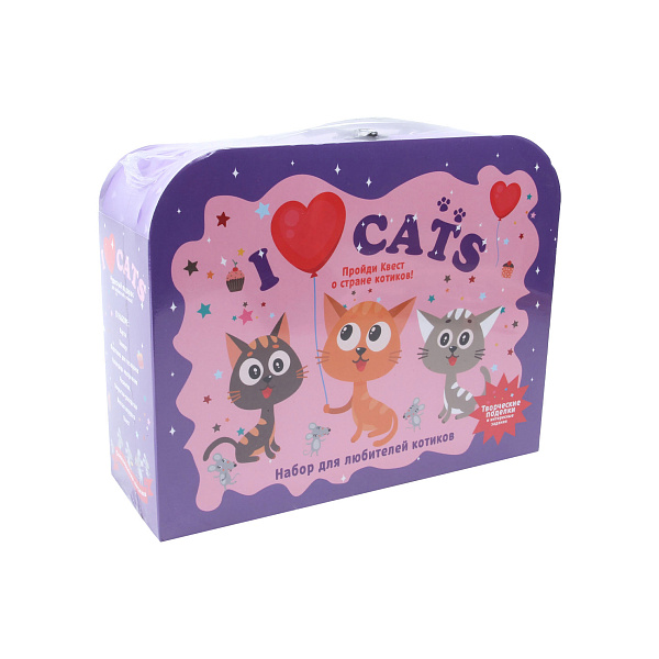 Небольшой чемоданчик с творческими поделками «Я люблю котиков» – это полезный набор с увлекательными поделками для малышей. Сам чемодан выполнен из плотного картона с металлическим замком. Внутри детей ждет карта с квестом по стране котов и заданиями к нему.