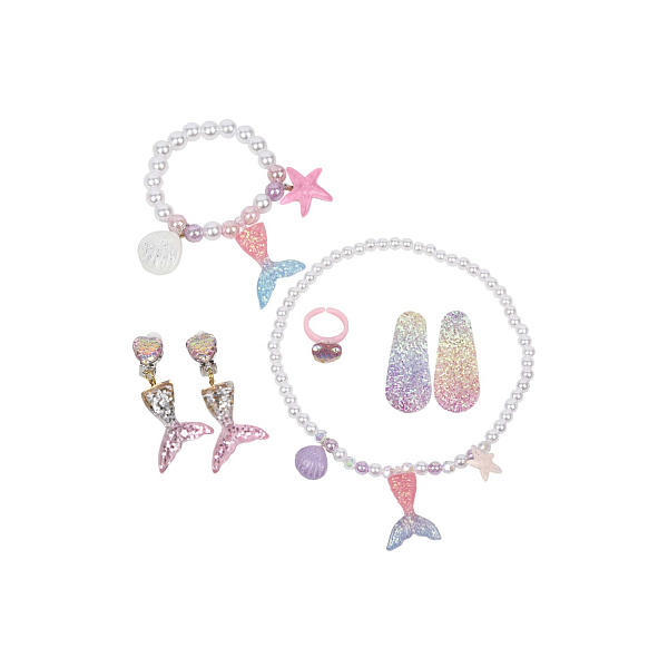 Большой набор украшений «Русалочка» подойдет девочкам, которые любят наряжаться. Украшения выполнены в морском стиле. Бусины в браслете и колье напоминают белый жемчуг. Есть дополнительные подвески в виде морских звезд, ракушек и хвоста русалки. Удобные серьги подойдут и для тех детей, которые еще не успели проколоть уши. Благодаря креплению клипсе носить их смогут все желающие.