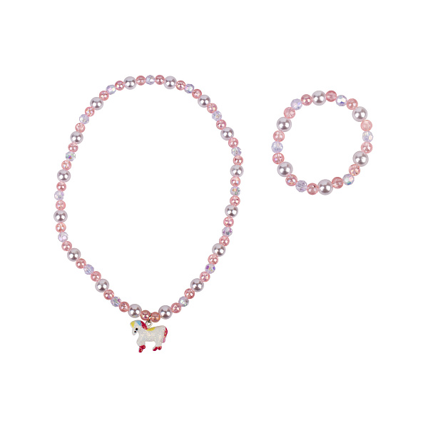 Набор украшений для девочек младшего возраста состоит из бус и браслета, соединяющих в себе бусины трех типов: крупный белый жемчуг, розовый перламутровый жемчуг, белые прозрачные кристаллы. Украшение дополнено полимерной подвеской в форме единорога. Такой набор подойдет для ежедневного использования или торжественного выхода девочке старше 3 лет. Изделие состоит из гипоаллергенных полимерных материалов, безопасных для детского здоровья. Для комфортного надевания браслет и бусы нанизаны на прочной эластичной тонкой ленте. Украшение понравится малышам и поможет им почувствовать себя неотразимыми.