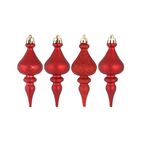 Набор состоит из четырех стилизованных сосулек красного цвета. Фигурное исполнение декора делает его похожим на устремленные вниз пики, состоящие из «яблока», кольца и острого наконечника. Такое украшение лучше всего смотрится на елке с декором в виде игрушек и бус теплых цветов.