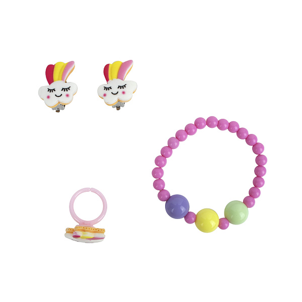 Клипсы и колечко в форме облачка с выходящей из него радугой дополнены модным браслетом из бусин разного размера. При изготовлении браслета учтены последние тенденции в изготовлении аксессуаров, поэтому браслет выглядит элегантно и привлекательно. Большие глянцевые бусины нежных тонов делают его особенно выразительным. Клипсы снабжены прочной алюминиевой застежкой, которая чудесно удерживает украшение и не пережимает детские ушки. Кольцо при этом может менять свой размер в соответствии с толщиной детского пальца. Комплект подойдет для девочек старше 3 лет.