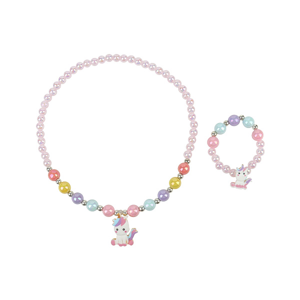 Набор украшений «Нежный», состоящий из ожерелья и браслета, понравится любой юной моднице. Детская бижутерия нежных пастельных тонов подойдет к платью подходящего оттенка. Украшения можно надеть на детский праздник или на семейное торжество. В них юная леди будет чувствовать себя неотразимой и соберет множество комплиментов. Легкие детали украшений соединены вместе на прочной растягивающейся нити из силикона. Каждое изделие дополнительно украшено кулоном в виде забавного единорога с цветным хвостом и гривой.
