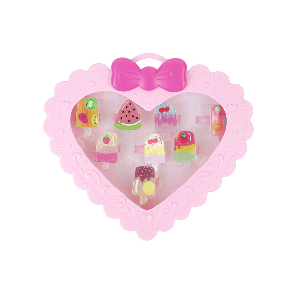 Коллекция детской бижутерии подойдет подрастающей моднице на праздник, прогулку с подругами или школьную дискотеку. В красочной упаковке в форме сердца ребенок найдет 8 колец с пластиковым декором, кольца вставлены в мягкую поролоновую подушку, у каждого аксессуара свое место. Дизайн выдержан в летнем стиле, каждое колечко выполнено в форме мороженого и фруктового льда на палочке. Яркие цвета и оригинальный дизайн добавят летней свежести в образ и разнообразят гардероб. Рекомендовано для детей старше 3 лет.