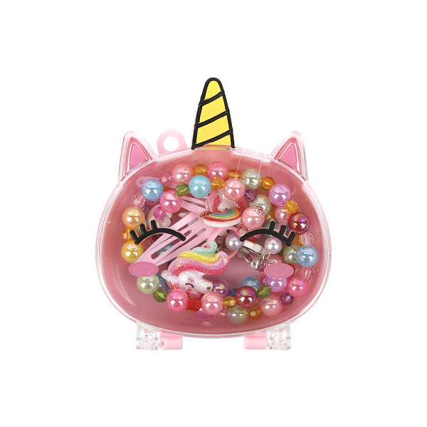 В комплекте 7 предметов: шкатулка, две заколки для волос, кольцо, браслет, бусы и серьги. Оригинальную коробку в виде милой морды единорога можно в дальнейшем использовать для хранения украшений.