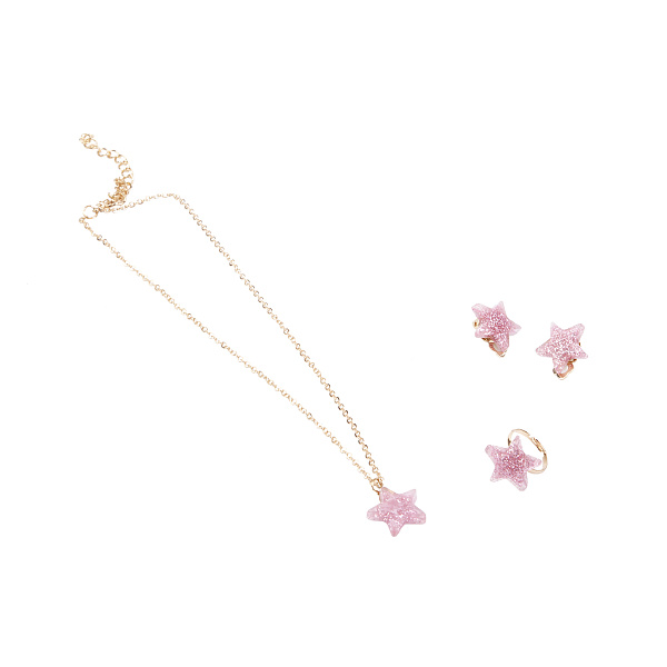 Розовые и бирюзовые блестки сияют на украшениях космического комплекта из полимерных звезд. В наборе пара серег, кольцо и цепочка с подвеской. Металлические детали имеют золоченое покрытие и изготовлены их медицинской стали. Серьги имеют формат клипс и подойдут даже тем девочкам, которые еще не прокололи мочки ушей. Кольцо регулируется по диаметру, а цепочка подвески имеет застежку-карабин и также регулируемую длину. Украшения чудесно дополнят праздничный наряд девочки и привлекут повышенное внимание.