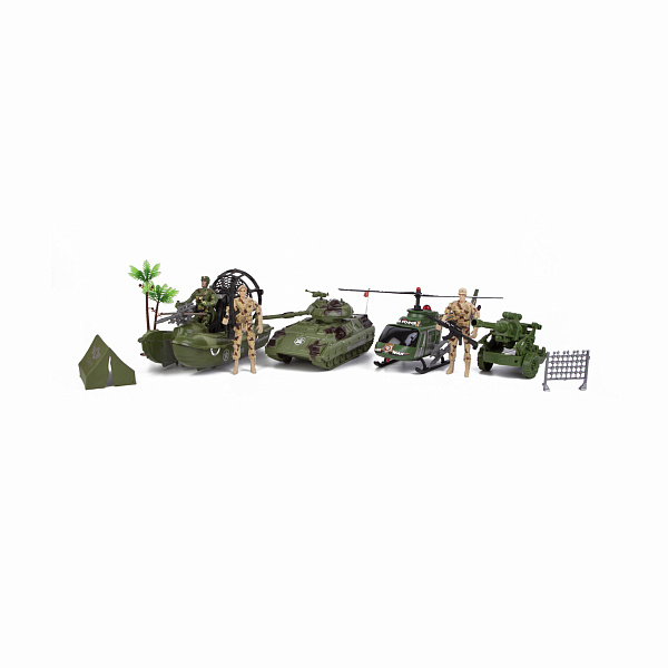 В комплект входит танк, вертолет, пушка, катер на воздушной подушке с пулеметчиком на борту, 2 солдатика, походная палатка, заграждение и даже пара пальм. Набор упакован в красочную картонную коробку с тематическими картинками. Каждый предмет детализован и выполнен в реалистичном дизайне. Игрушки прочные, но легкие. Набор входит в серию игрушек военной тематики.