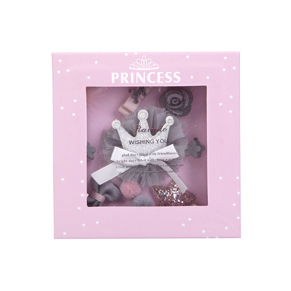 Перед вами подарок для настоящих принцесс — чудесный нестандартный вариант на День Рождения или нарядный аксессуар для фотосессии. В картонной коробке с прозрачным окошком и надписью «Princess» представлено 9 украшений для волос в едином стиле и цветовой гамме. Заколка с меховыми бубонами и вышивкой, пушистым шариком с серебряными ушками, короной с глиттерным напылением на сером фоне, блестящей розовой звездой, усыпанной блестками розой и два зажима-крабика — каждый из них станет как самостоятельным декоративным элементом прически, так и праздничным комплектом.
