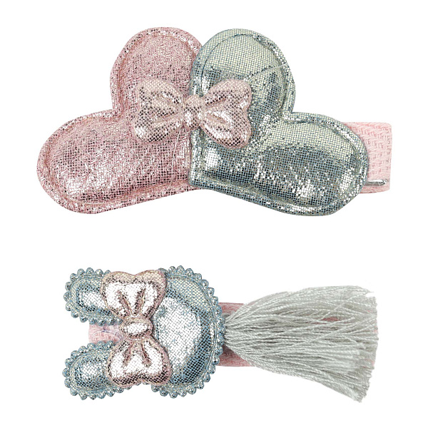 Металлическая основа обработана мягкой текстильной лентой, что защищает детскую кожу от повреждений и не спутывает волосы. Декор в форме зайчика и сердечек выполнен из сияющей ткани, а милая кисточка придает аксессуарам нежный и романтичный вид.