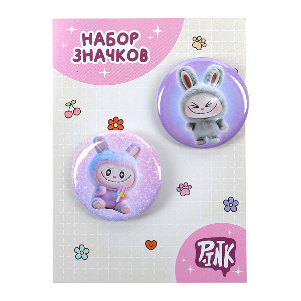 Набор значков «Монстры» — это два круглых металлических значка с изображением забавных персонажей в стиле Лабубу: один в розовом капюшоне с закрытыми глазами, другой в сером — с широко открытыми глазами и острыми зубками. Значки оформлены на картонной подложке с милым дизайном — в розово-белой гамме, с цветочками, лапками и надписью «ПИНК». Идеально подходят для украшения одежды, рюкзаков или сумок, добавляя образу игривости и индивидуальности.