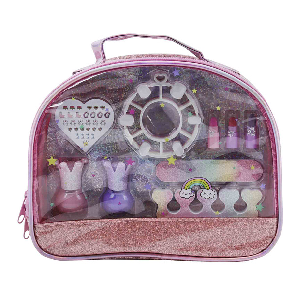 Набор для макияжа и маникюра содержит разные элементы для творческих игр и ухода за ногтями. В комплект входят накладные ногти, лаки для ногтей разных оттенков, помада, наклейки и аппликаторы для макияжа. Все предметы удобно размещены в прозрачной блестящей сумочке с ручкой, которую легко брать с собой.