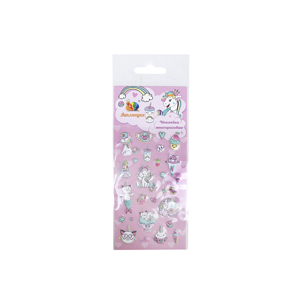 Многоразовые наклейки со сказочным единорогом и котиком внесут разнообразие в личные вещи ребенка. Их можно легко наклеить на тетради, пеналы и даже игрушки. Наклейки сохраняют свои клеящие свойства даже после многократного использования. В основе использованы полимерные материалы с клеевым слоем. Манипуляции с наклейками развивают моторику рук и аккуратность. В упаковке 26 наклеек, которые ребенок может использовать по своему усмотрению. Рекомендовано для детей старше 3 лет.