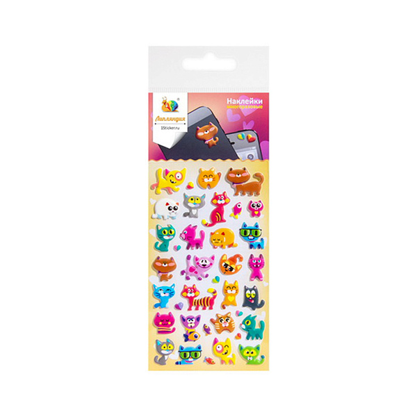 Красочные и яркие наклейки с изображениями кошек представлены в упаковке на прозрачной подложке в количестве 36 штук, из них 27 наклеек с кошками и ещё 9 с рыбками и сердечками. Наклейки имеют объем и изготовлены из мягкого приятного на ощупь материала. Клеевая основа позволяет многократно использовать наклейки по назначению, сохраняя их клейкие свойства. После удаления наклейки с поверхности не остается липких следов, так что можно не переживать о внешнем виде мебели или бытовой техники, если ребенок решит придать им индивидуальности при помощи наклеек.