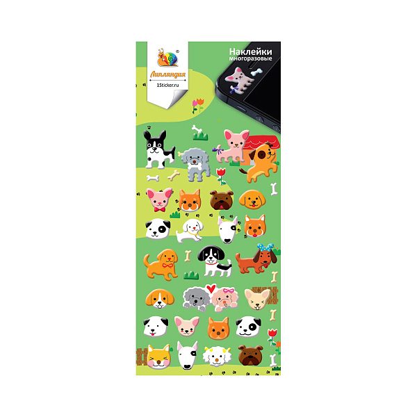 Большой набор объемных многоразовых наклеек понравится поклонникам собак. На прозрачной подложке представлены яркие наклейки с рисунками собачек разных цветов и пород, а также дополнительные клеевые элементы в виде косточек, цветов, травы. При помощи наклеек можно украсить мобильный телефон, планшет, компьютер, рюкзак, красиво оформить записи в тетради или блокноте. Наклейки можно многократно отклеивать и приклеивать, от этого не страдает их внешний вид, и они также плотно держатся, как при первом использовании. Не стоит переживать, если ребенок приклеит наклейку на мебель, бытовую технику или стекло – стикер легко удаляется и не оставляет следов на поверхности.