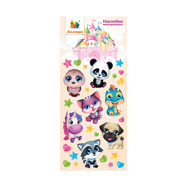 Набор представляет собой комплект наклеек на прозрачной подложке, который включает семь нарисованных персонажей: панду, сову, дракона, кота, единорога, собаку и енота, а также аксессуары в виде разноцветных звездочек и сердечек. Наклейками можно украсить желанию ребенка канцелярию или гаджеты. А если что-то пойдет не так и наклейка окажется приклеенной в неподходящем для этого месте, ее можно легко удалить и снова использовать, при этом липкого следа на поверхности не останется. Наклейки имеют небольшой размер и станут чудесным украшением записей или рисунков в блокноте, тетради, их можно применить для творческих занятий.