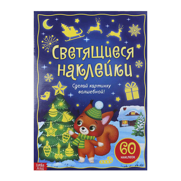 В издании представлена яркая, детализированная фоновая сцена с зимним пейзажем, на которой изображены заснеженные домики, пушистые ели, новогодние персонажи и фейерверки в небе. На страницах книги ребенок найдет 60 уникальных светящихся наклеек с самыми разнообразными новогодними и зимними мотивами — от пушистых снежинок и мерцающих звезд до Деда Мороза на санях, подарков, елочных игрушек.
