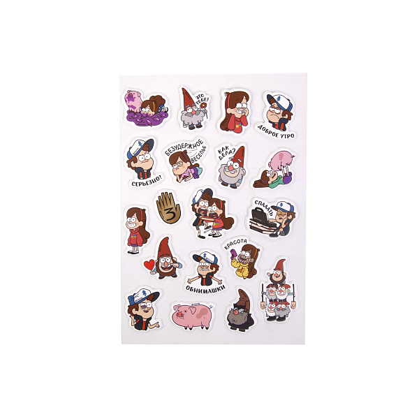 Герои мультфильма «Грвити Фолз» на протяжении нескольких сезонов радовали зрителей своей находчивостью, способностью не только выйти из нелепых ситуаций, но и многократно туда попасть. Тонкий юмор и оригинальность сделали сериал популярным среди детей и подростков. Набор наклеек с изображением героев любимого мультфильма понравится всем поклонникам сериала. Смешные и серьезные герои будут прекрасно смотреться на обложках книг и дневников, аксессуарах, игрушках, предметах интерьера. Наклейки изготовлены из мягкого полимера с клеевым слоем, не теряющим своих свойств при многократном использовании. На лицевой стороне наклеек нанесена устойчивая типографская печать, набор упакован в целлофановый конверт. Рекомендовано для детей с 3 лет.