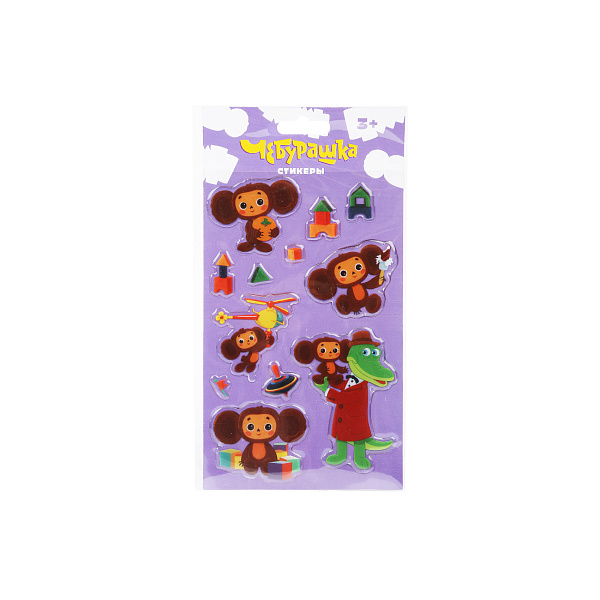 В упаковке 12 стикеров с изображением Чебурашки, Крокодила Гены, игрушек.
