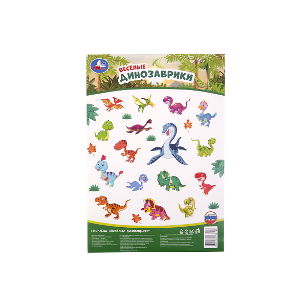 Яркие и забавные наклейки «Веселые динозаврики» для любителей динозавров крепко держатся на стеклянных, деревянных, пластмассовых, металлических и бумажных поверхностях. Самая большая по размеру наклейка – с голубым доисторическим обитателем морских глубин. Остальные наклейки с динозаврами – среднего размера. Маленькие – с листьями и кустами. Ребенок придумывать истории и создавать картины с помощью этого набора. Печать на самоклеящейся бумаге качественная и яркая. Рекомендуется использовать под присмотром взрослых. |