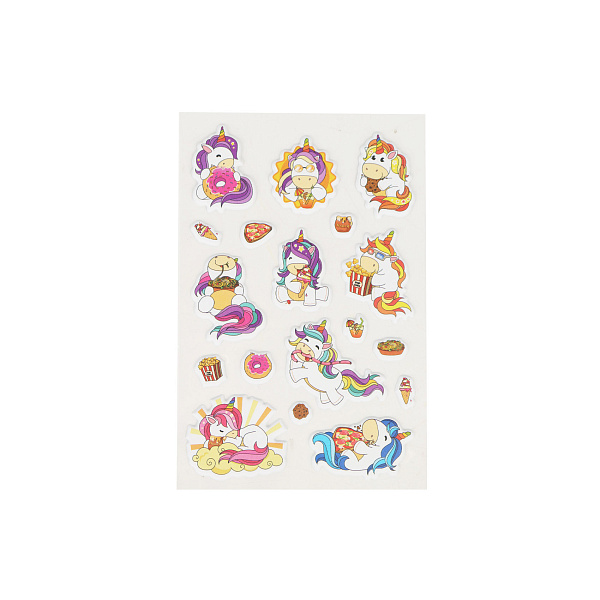 Порадовать маленьких любителей животных можно с помощью многоразовых наклеек. На прозрачном листе расположено 18 наклеек с единорогами и сладостями, они объемные и мягкие на ощупь. Украсить наклейками можно канцелярию, тетради, пеналы и телефон. Клеящие свойства сохраняются даже после многократного использования. Наклейки выполнены из полимерных материалов с клеящим слоем. Манипуляции с изделием тренируют моторику рук, чувство стиля и усидчивость. Рекомендовано для детей старше 3 лет.