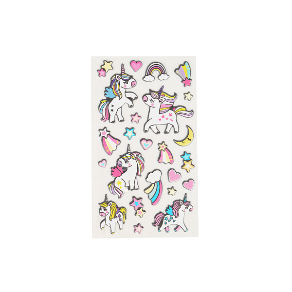 Порадовать маленьких любителей животных можно с помощью многоразовых наклеек. На прозрачном листе расположено 23 наклейки со сказочными единорогами, они объемные и мягкие на ощупь. Украсить наклейками можно канцелярию, тетради, пеналы и телефон. Клеящие свойства сохраняются даже после многократного использования. Наклейки выполнены из полимерных материалов с клеящим слоем. Манипуляции с изделием тренируют моторику рук, чувство стиля и усидчивость. Рекомендовано для детей старше 3 лет.