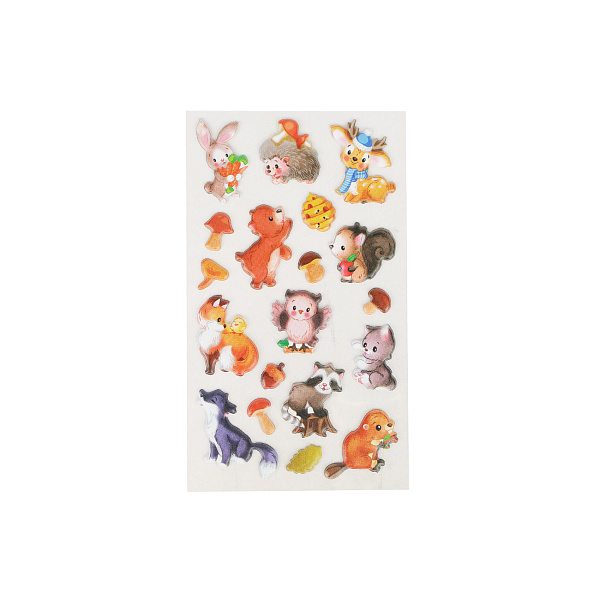 Порадовать маленьких любителей животных можно с помощью многоразовых наклеек. На прозрачном листе расположено 19 наклеек с лесными животными, они объемные и мягкие на ощупь. Украсить наклейками можно канцелярию, тетради, пеналы и телефон. Клеящие свойства сохраняются даже после многократного использования. Наклейки выполнены из полимерных материалов с клеящим слоем. Манипуляции с изделием тренируют моторику рук, чувство стиля и усидчивость, а также знакомят с миром фауны. Рекомендовано для детей старше 3 лет.