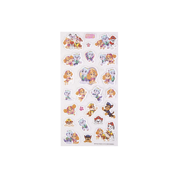 Большой набор наклеек для поклонников «Щенячьего патруля» состоит из 25 фигурных наклеек разного размера с красочными картинками. На наклейках изображены не только щенки-персонажи мультика, но и забавные отпечатки лап, поэтому из наклеек набора можно составлять занимательные и оригинальные композиции.