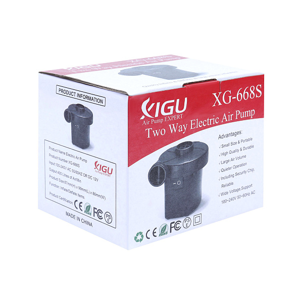 Электрический насос имеет в комплекте 3 насадки, применяется для подкачки лодок, матрасов, бассейнов, прочих надувных изделий и аксессуаров. В качестве источника питания можно использовать сеть 220V или прикуриватель автомобиля. Уровень потребляемой мощности составляет 50Вт. Аппарат обладает компактными габаритными размерами, незаменим в автопутешествии. Его производительность составляет 36 тысяч л/час. Устройство имеет несложную конструкцию, изготовлено из прочного пластика, дополнено необходимой электроникой. При соблюдении требований к эксплуатации прослужит длительное время без потери технических параметров.