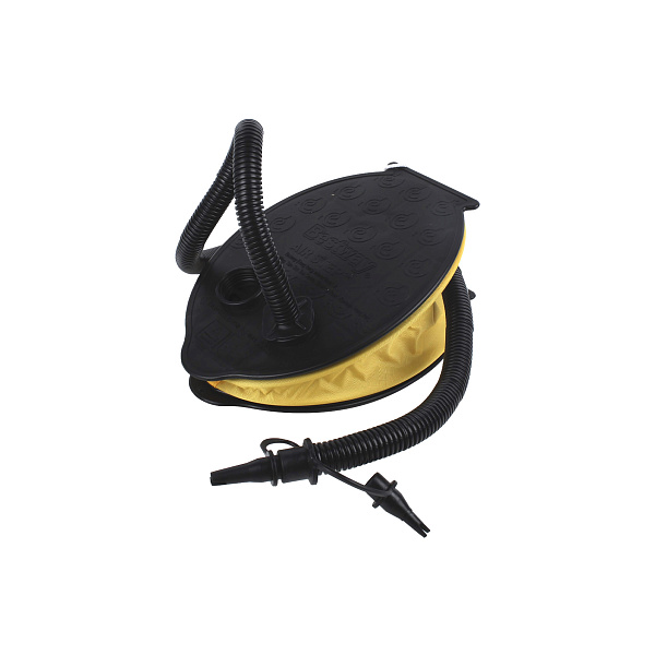 Насос для накачивания и сдувания надувных матрасов, мячей и мебели. Нижняя и верхняя часть педали сделаны из пластмассы, а меха из воздухонепроницаемой ткани. Внутри насоса установлена пружина, снаружи находится веревочный ограничитель, который не дает пружине оторвать пластиковую крышку от ткани. Объем насоса составляет 0,8 л, поэтому за одно нажатие вы перекачиваете в предмет почти литр воздуха. Гибкий шланг из пластмассы имеет 3 несъемных насадки для клапанов разной модификации, так что можете не бояться, что случайно их потеряете. Гибкая конструкция шланга облегчает его присоединение к мячу или матрасу.