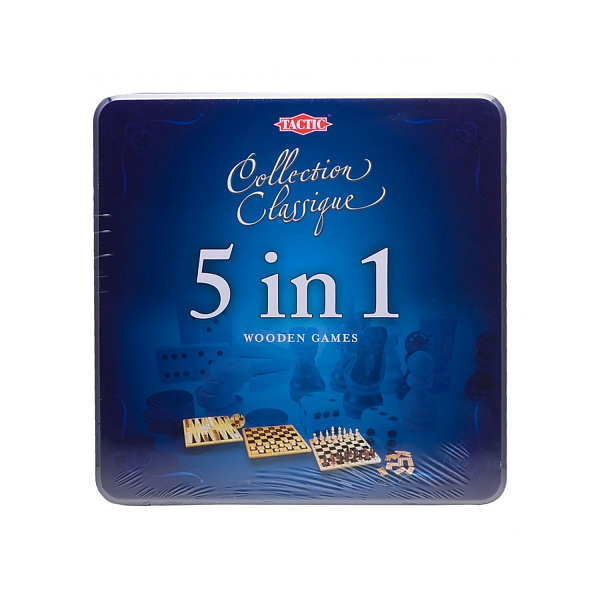 Набор настольных игр Tactic 5в1 включает в себя шахматы, шашки, нарды, домино и крестики-нолики. С одной стороны доски расположено поле в клеточку для игры в шахматы и шашки, а с другой – разметка для крестиков-ноликов и поле для игры в нарды и домино. Игры, вошедшие в набор, являются классикой, которую по-настоящему оценят и дети, и взрослые. Подарочная коробка набора делает его отличным подарком, а также позволяет комфортно хранить и транспортировать игры. Все детали изготовлены из дерева. Подходит для 2 игроков и более. Предназначено для детей старше 7 лет.