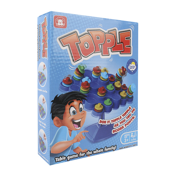 Настольная игра «Topple» — динамичная и занимательная игра, в которой участники по очереди выкладывают разноцветные фишки на игровую платформу, стараясь удержать балан и не уронить башню. Игроки набирают очки, создавая ряды из пятерок или собирая стопки из четырёх и более фишек одного цвета. Игра держит в напряжении и требует точности, внимательности и стратегического планирования.