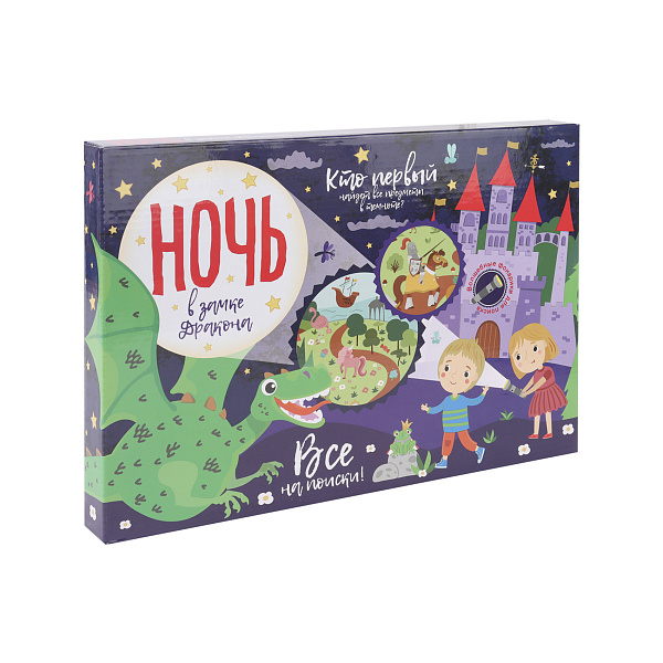 Настольная игра «Ночь в замке дракона» создана как для малышей, достигший возраста 3 и более лет, так и для их родителей. В набор включены два картонных фонаря, игровое поле и карточки с заданиями. Игрокам придется искать указанные в карточках-заданиях предметы на игровом поле, используя помещенный в конверт фонарик. Сделать это будет не так просто – изображения изобилуют мелкими деталями, а сами предметы порой очень хорошо спрятаны, причем в самых непредсказуемых местах. Подробные правила прохождения игры напечатаны на ее упаковке.