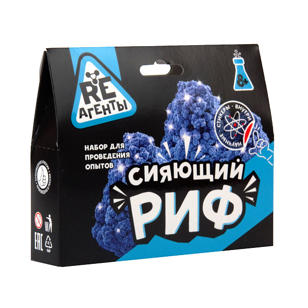 Соберите каркас будущего рифа из картонных деталей и установите его на подставку. Налейте реагент и ожидайте кристаллизацию. Картон пропитается химическим составом, и на стенках начнут образовываться яркие сверкающие кристаллы. Готовый риф украсьте при помощи блесток. В наборе в качестве бонуса представлен набор наклеек с наименованиями других химических опытов данной серии.
