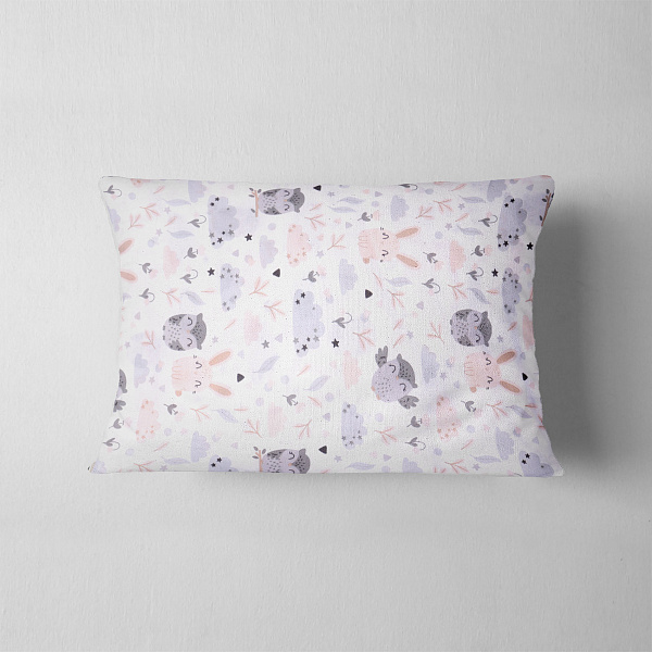 Наволочка украшена милым принтом с совами и зайчиками на светлом фоне. Красочные и дружелюбные изображения помогут создать атмосферу тепла и уюта в детской комнате.