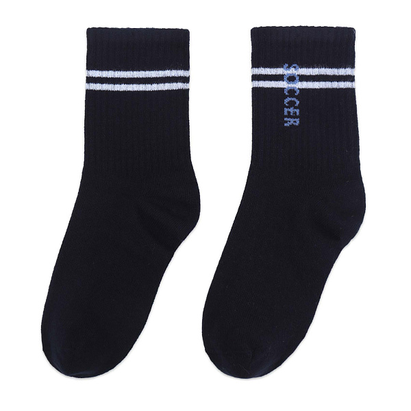 Черные носки подходят для мальчика. Белые горизонтальные полоски идут по верхней части. Дизайн выглядит просто и динамично. Носки облегают ногу. Они подходят для повседневной носки, игр и спорта.