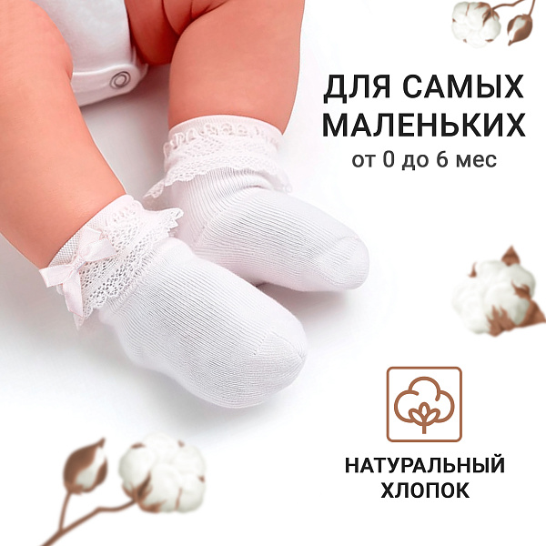 Белые носочки для девочки украшены изящным кружевом и аккуратным бантиком, придающими изделию нежный и праздничный вид. Такая пара станет отличным аксессуаром для создания утончённого образа и легко сочетается с различной детской одеждой.