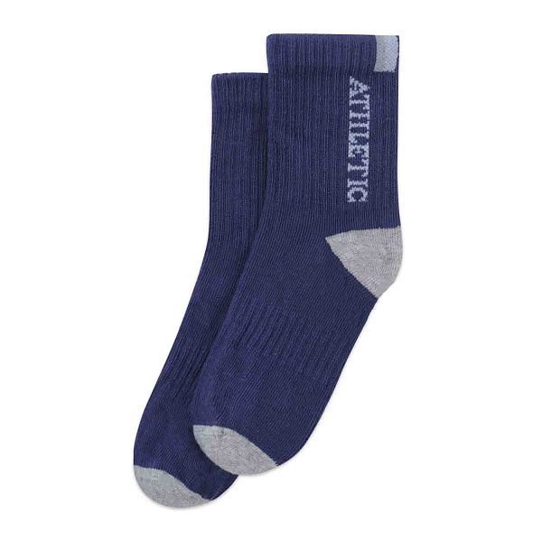 Носки для мальчика имеют синий цвет. Они ребристые по всей длине. На внешней стороне видна белая надпись ATHLETIC. Пятка и носок выполнены в сером оттенке. Носки подходят для спорта и игр. Они плотно облегают ногу. Дизайн простой и яркий.