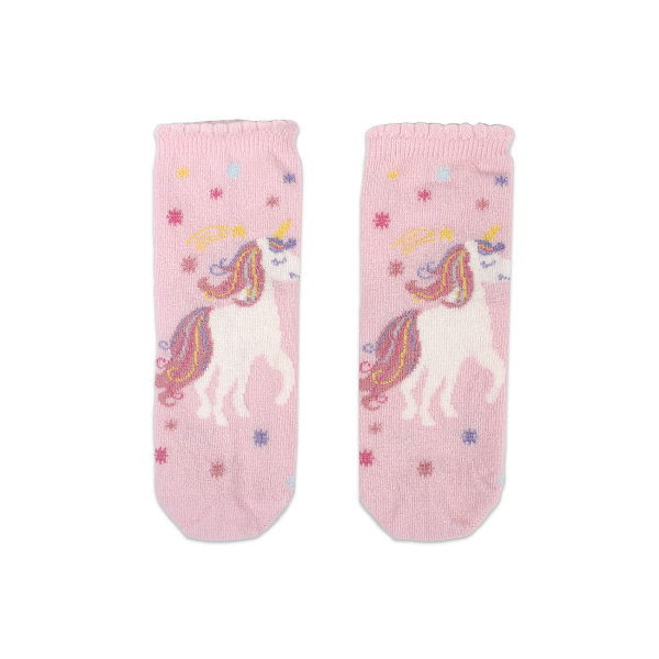 Если хотите не только утеплить ноги ребенка, но и поднять ему настроение – дополните его гардероб этими забавными носками. Ткань украшена изображениями звезд и единорогов – такой дизайн порадует ребенка и добавит в его образ яркий акцент. В основе ткани комбинация 80% хлопка, 18% полиамида и 2% эластана. Такое сочетание ткани не только обеспечивает хороший воздухообмен, но и приятное прилегание к нежной коже и эластичность материала – носочки плотно сядут на детскую ногу, но не будут сдавливать ее. Рекомендовано для детей младшего возраста.