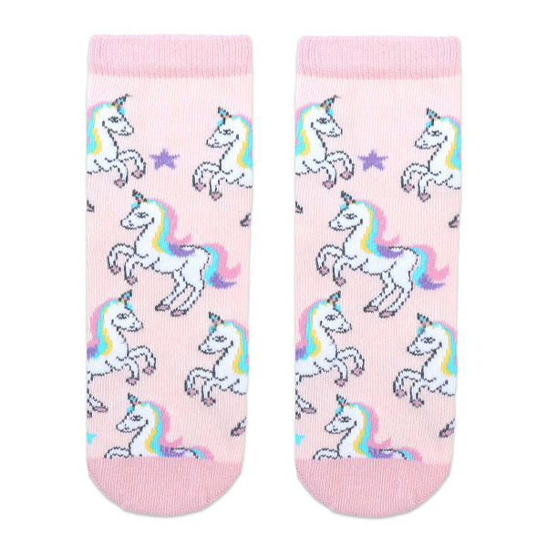 Носки для девочек выполнены в розовом цвете. Носки украшены белыми единорогами с радужными гривами и фиолетовыми акцентами. Материал состоит из хлопка, полиамида и эластана. Это делает носки мягкими и дышащими. Носки подходят для повседневной носки.