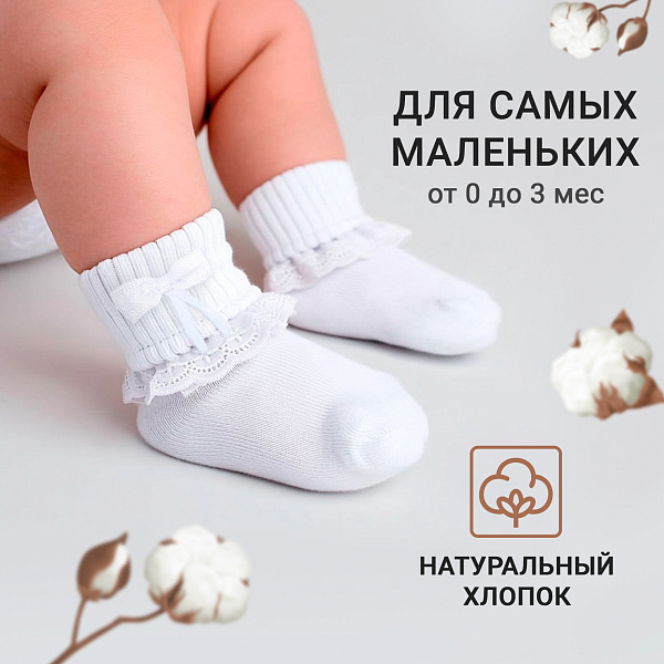 Носки для девочки имеют аккуратную резинку с рельефной фактурой, украшенную нежным кружевом по краю и маленьким декоративным бантиком, который добавляет изящества и подходит для праздничных или повседневных образов. Белый цвет и декоративные элементы придают носкам лёгкость и нежность, идеально сочетающуюся с детской одеждой.