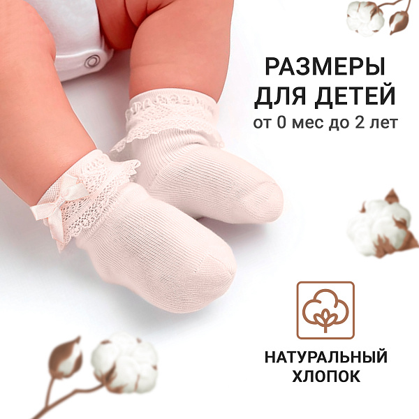 Носки для девочки имеют аккуратную резинку с рельефной фактурой, украшенную нежным кружевом по краю и маленьким декоративным бантиком, который добавляет изящества и подходит для праздничных или повседневных образов. Светло-розовый цвет и декоративные элементы придают носкам легкость и нежность, идеально сочетающуюся с детской одеждой.