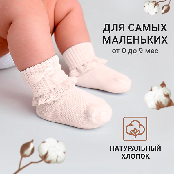 Носки для девочки имеют аккуратную резинку с рельефной фактурой, украшенную нежным кружевом по краю и маленьким декоративным бантиком, который добавляет изящества и подходит для праздничных или повседневных образов. Светло-розовый цвет и декоративные элементы придают носкам легкость и нежность, идеально сочетающуюся с детской одеждой.
