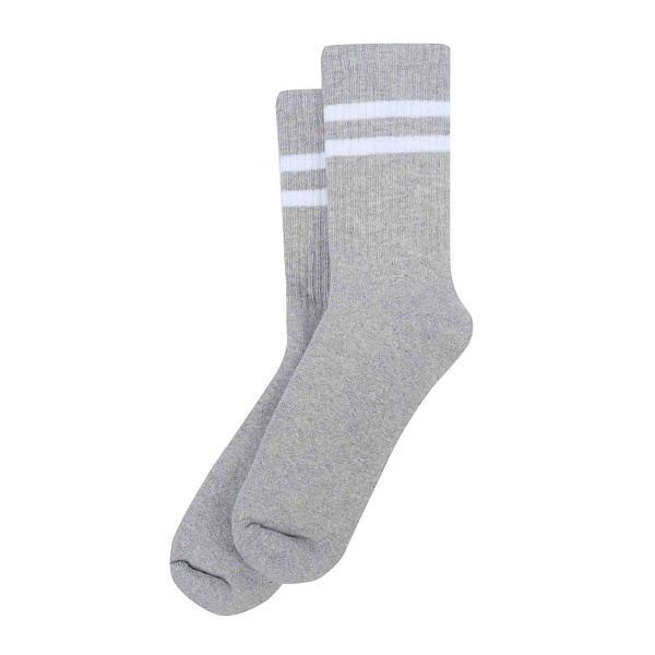 Теплые носки выполнены в универсальном сером цвете с двумя белыми полосками в верхней части, что придает им стильный и классический вид. Модель имеет классическую форму с плотной резинкой, обеспечивающей комфортную и надежную посадку на ноге, а также дополнительную теплоизоляцию для холодного времени года.